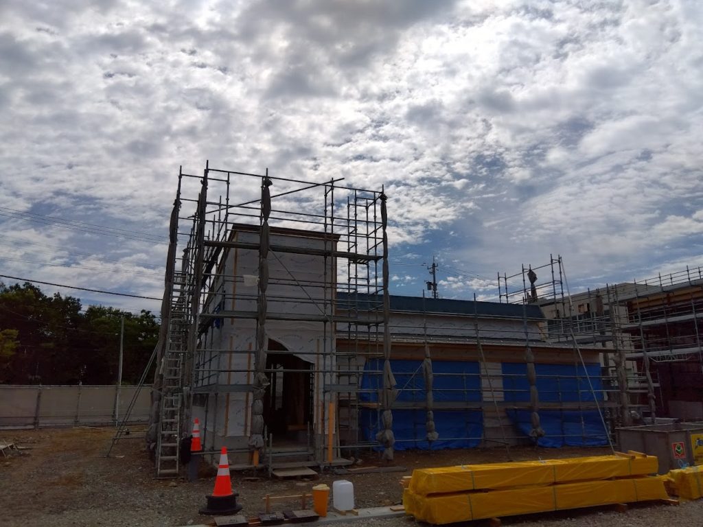 オープン約1ヵ月前の様子です!足場も取れて看板以外の建屋はほぼ完成したようです。