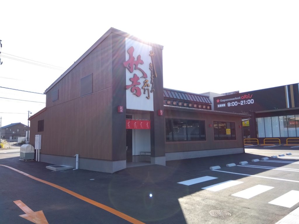 (旧)パスコは建て替え後は平面駐車場を囲むようにテナントが並ぶ形となります。「秋吉 太閤山店」はその中でオープン一番手!その後、隣にある「松屋/松のや 射水太閤山店」、中核店舗である「アルビス 太閤山店」の順でオープンされました。